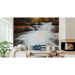 Fototapeta Jesienny Wodospad FT-560 to malowniczy widok spadającej wody w otoczeniu złotych liści, który wprowadzi do wnętrza spokój i naturalne ciepło. Idealna do salonu, sypialni lub biura – tworzy przytulną i relaksującą atmosferę.