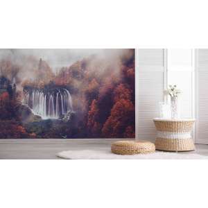 Fototapeta Jesienny Wodospad FT-563 to nastrojowy pejzaż z wodospadem wśród mgły i złotych liści. Doskonała do wnętrz, które potrzebują odrobiny spokoju i kontaktu z naturą.