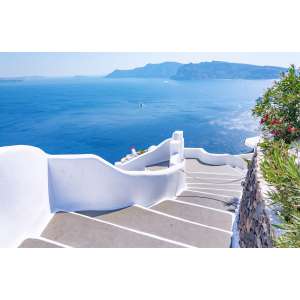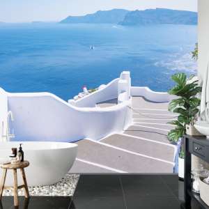 Fototapeta Greckie Schody na Plażę to dekoracja przedstawiająca malownicze schody prowadzące na plażę, idealna do wnętrz inspirowanych śródziemnomorskim klimatem.