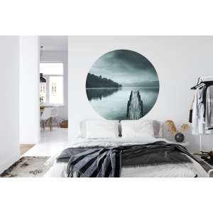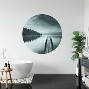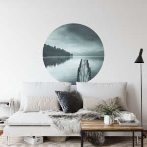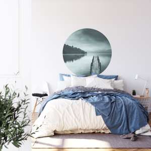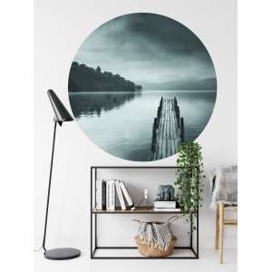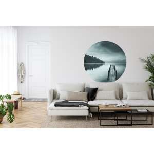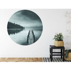 Fototapeta Okrągła Widok na Jezioro z Molo to dekoracja z artystycznym pejzażem wodnym, idealna do wnętrz inspirowanych spokojem, naturą i minimalizmem.
